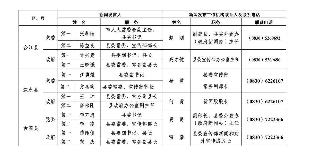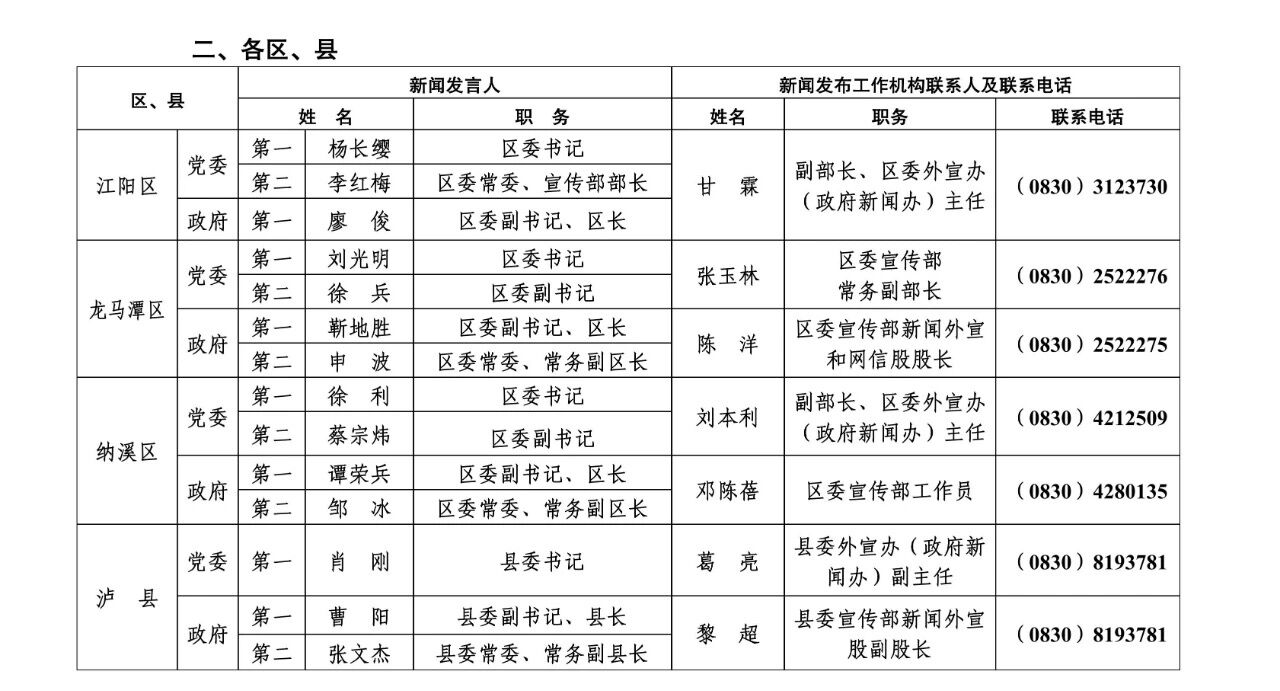 四川在线消息(记者 魏冯)近日,泸州公布全市新闻发言人名单及工作机构电话,本次公布的名单按照市委、市政府、市委有关部门、市政府有关部门、县(区)等进行分类。