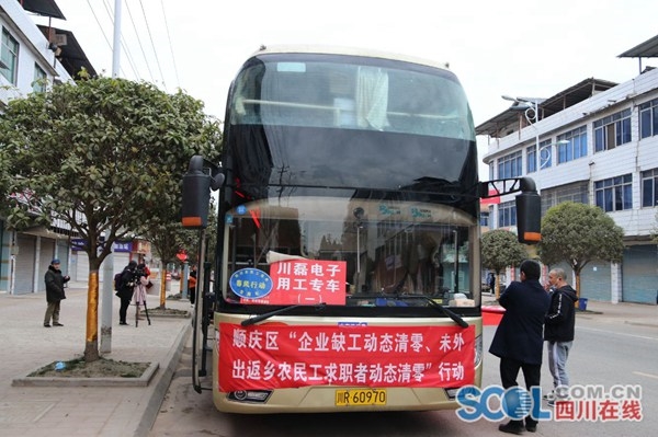 四川在线消息(周子榆 记者 蒲南溪)3月14日上午,贴有“四川农民工返岗春风行动专用车”标签的两辆大巴先后驶入南充市顺庆区芦溪镇和金台镇,护送128名农民工赴市内工厂企业进行现场面试。
