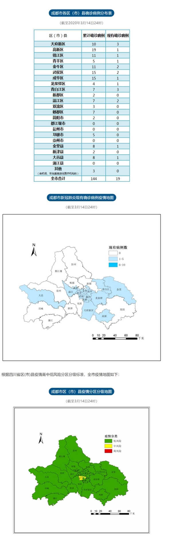 截至3月14日24时,成都市累计报告确诊病例144例,累计出院122人,死亡3人,其余19人均在定点医院隔离治疗,74名密切接触者正在接受医学观察。