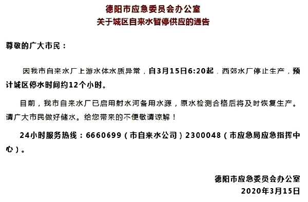 四川在线消息(记者 邵明亮)3月15日,德阳市应急委员会办公室发布通告称,因自来水厂上游水体水质异常,自3月15日6时20分起,德阳市西郊水厂停止生产,预计城区停水时间约12个小时。目前,德阳市自来水厂已启用射水河备用水源,原水检测合格后将及时恢复生产,请广大市民做好储水。