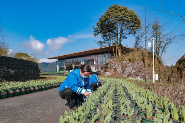 四川在线消息(张超 黄刚记者 文莎)3月10日,雅安大熊猫国家公园南入口社区项目清风雅雨小镇内,数十名工人在绿化地里进行补苗、除草。在这里,从荷兰引进的100多个品种、近20万株郁金香含苞待放,“观赏花卉+玄武岩景观石”与周边的原始森林相得益彰,黑石公园雏形初现。