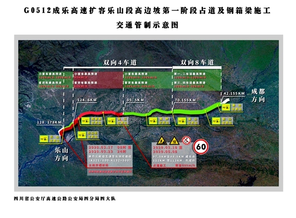 3月16日,G0512成乐高速扩容乐山段高边坡第一阶段占道及钢箱梁施工交通管制新闻通气会在乐山召开,记者从会上获悉,3月18日8时至5月8日24时,成乐高速公路眉山青神至乐山棉竹路段(K95+500至K124+600)高边坡线外开挖占用车道施工;3月17日8时至3月23日24时,成乐高速棉竹北枢纽互通至张徐坝枢纽路段(K121+600至K132+500)将进行全幅封闭施工,届时,部分路段将实施交通管制。