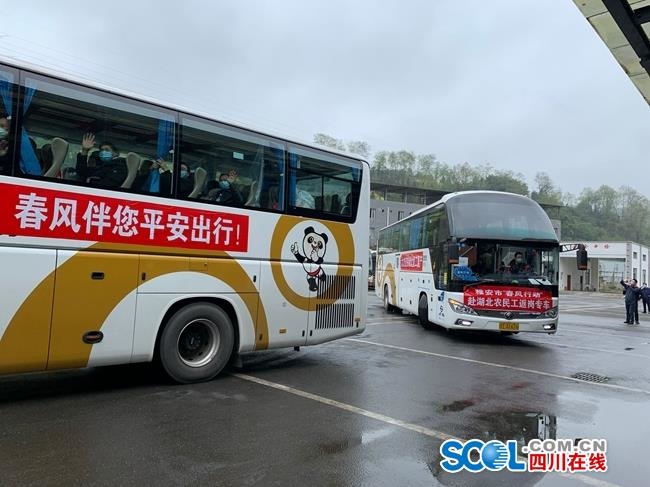 四川在线消息(记者 王眉灵)“祝大家一路平安,顺利复工!”带着家乡亲人的祝福,3月17日上午10点半,载着98名农民工的4辆包车从雅安市芦山汽车站发出,直奔湖北省黄冈市红安县。这是我省交通运输部门根据用工企业需求、组织开行的首趟赴鄂农民工安全返岗“春风行动”客运专车。