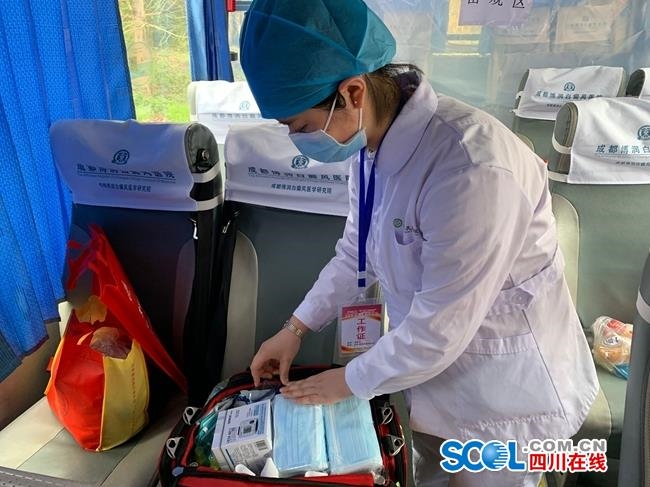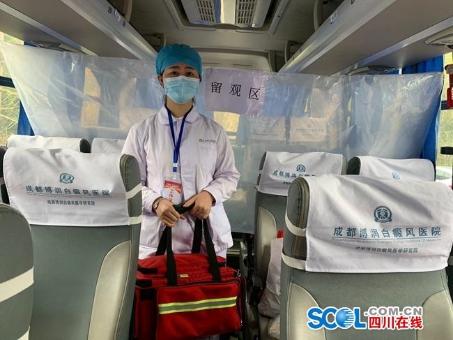 上午10时许,简单的发车仪式后,务工人员排着队,接受体温检测后登车。芦山县人民医院护士高思杰将随车“护航”,她的背包里装着口罩、消毒液、血压计等应急物资,“如果路上有乘客身体异常,我们将及时处置。”她指着车后座两排设置的“留观座”说,在车上,乘客有异常将被移到这里观察,与其他乘客隔离开来。