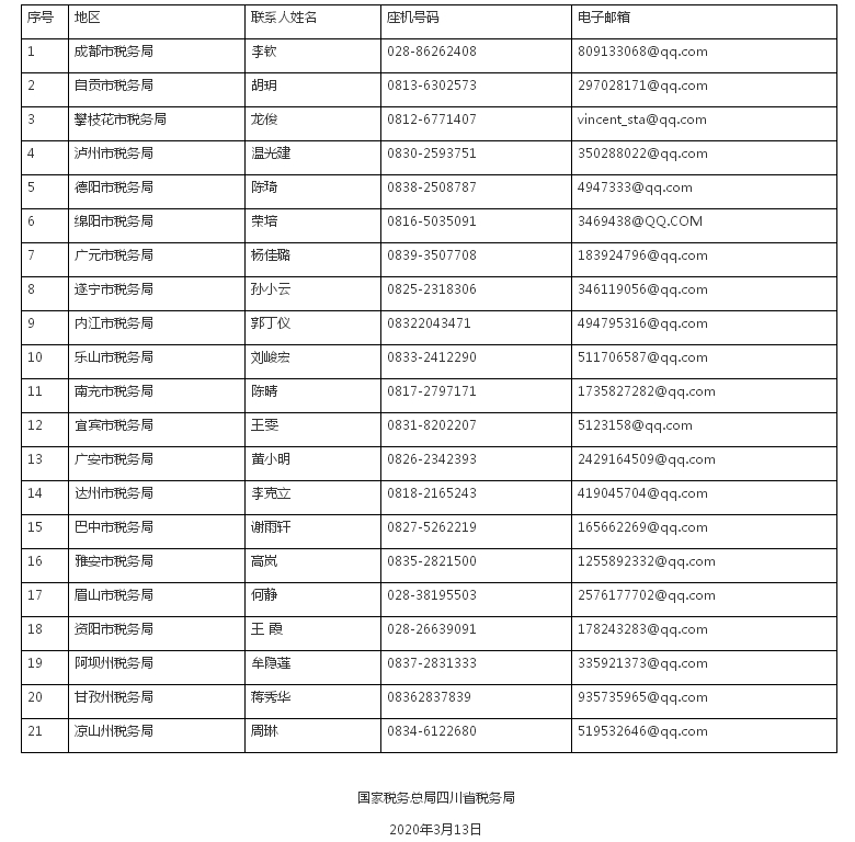 四川省电子税务局国际税收业务各市(州)局直联人员名单及联系方式如下: