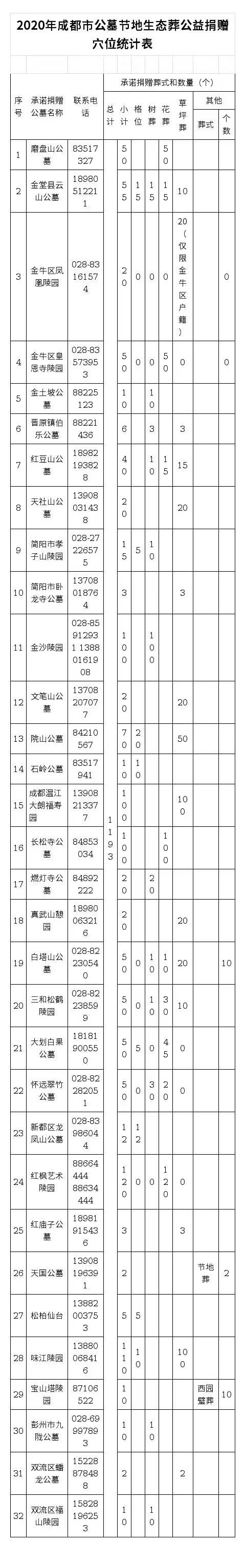 近年来,成都市持续开展节地生态穴(格)位捐赠活动,2019年,全市26家公墓机构公益捐赠1121个节地生态葬穴(格)位,其中5家公墓在清明节期间举行了集中落葬仪式,收到了良好的社会效应。