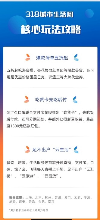 据介绍, “318城市生活周”将从3月18日持续到4月6日,覆盖餐饮、快消、电影、旅行等大众消费领域。成都等12城用户可率先享受“吃货卡”等全新产品、特价美食等福利,如特价囤飞猪近两万家酒店和景区门票,足不出户、通过直播来“云逛街”、“云旅游”……