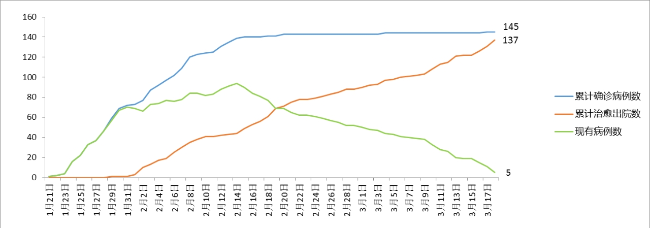 据最新的新冠肺炎病例变化曲线图显示,成都现有累计确诊病例人数145人,累计治愈出院人数137人,现有病例人数5人。按照相关通报,这5人均在定点医院隔离治疗。尚有259人(含外地确诊病例在蓉管理的密切接触者)正在接受医学观察。从曲线图上看,与昨日相比,累计治愈出院人数增加6人,累计治愈出院人数正在不断接近累计确诊病例数。