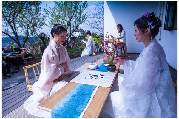 桃花故里景区“两忘”民宿,身着古典服饰的茶艺师,正精心演绎泡茶过程。旁边,一名书法爱好者挥毫泼墨,写下“你若不来花不开”……
