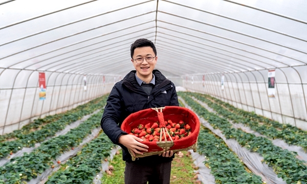 刘海川今年25岁,但这已经是被成都轨道集团派驻到简阳市雷家镇石岩寺村开展驻村帮扶工作的第二个年头。 2019年,他牵头建成了村级农业产业园,带领贫困户种上了高品质大棚草莓,可疫情来袭,村民出不去,经销商进不来,眼看上千斤草莓就要烂到了棚里,“致富果”要变成“赔钱果”, 刘海川充当起了园区草莓的“销售员”、“快递员”和“售后员”。