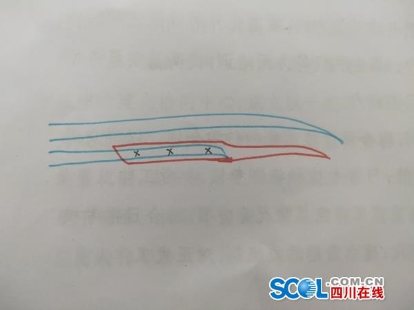 (图片说明:蓝色部分为朱鹮原本的喙,红色部分为“人工喙”,x部分为穿孔点。在重合部分穿孔后,用金属丝穿过并绕至喙的下方“打结”固定。)