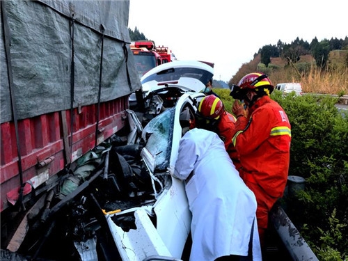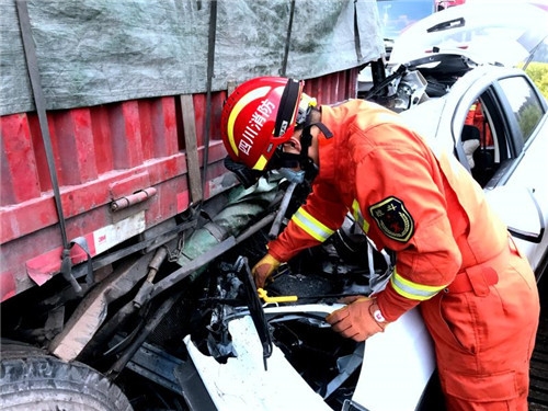 7时20分,消防指战员到达现场,经侦察发现,事故现场一辆小轿车追尾货车,轿车右侧半个车身插入货车底盘,轿车司机被困车内,生命垂危,亟待救援。根据现场情况,现场指挥员立即命令警戒组协同高速交警做好现场警戒、管制过往车辆,救援组利用液压破拆工具组对车辆进行破拆,开辟救援空间,同时做好保护措施,防止对被困人员造成二次伤害。经过近10分钟的紧张救援,被困人员被成功救出,并移交现场120医护人员。