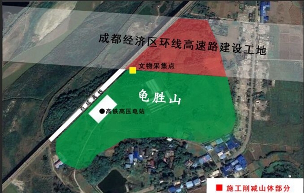 18日上午,刘章泽和旌阳区文管所所长邓丽等赶赴现场调查。发现文物的地方位于三绕成绵高速公路互通西侧、绵远河和西成高铁东侧,公路路面已基本成形,山体北部已经被挖掉,公路南侧的大部分山体未遭破坏。据了解,修建西成高铁时山体已经被部分破坏。文物部门将采集文物标本带回去整理研究,并安排镇村对山体进行保护,待以后适时进一步开展勘探发掘工作。