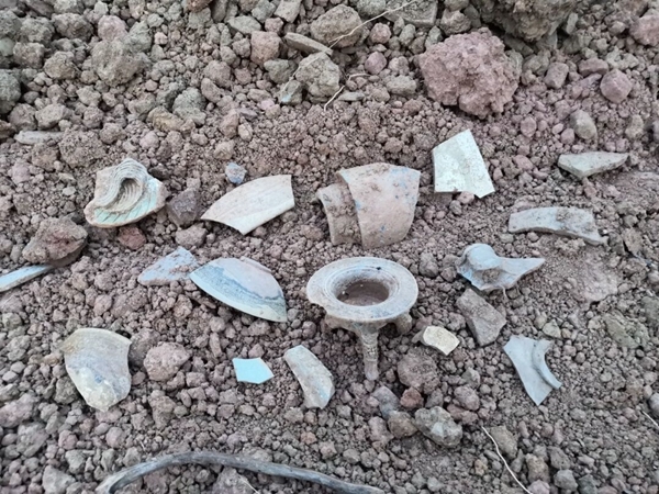 古建筑维修从业者张胤潍、华中科技大学研究生彭启晗、长江大学学生杨和堃都是文物保护志愿者,3月17日下午,他们按照文献记载中的龟胜山道场推测位置来到三绕德阳北绵远河东侧施工现场,山体北部已经被挖掘机由西向东挖开,露出了巨大的山体剖面,浮土中散落大量的陶瓷片和筒瓦、琉璃构件等建筑材料。他们随即报告给了德阳市文物考古研究所所长刘章泽。