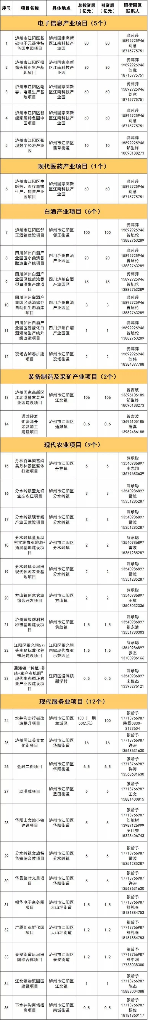 本次推介会,集中发布2020年江阳区重点招商引资项目35个,其中电子信息产业项目5个、现代医药产业项目1个,白酒产业项目6个、装备制造及采矿产业项目2个、现代农业项目9个、现代服务业项目12个,共计投资736亿元。