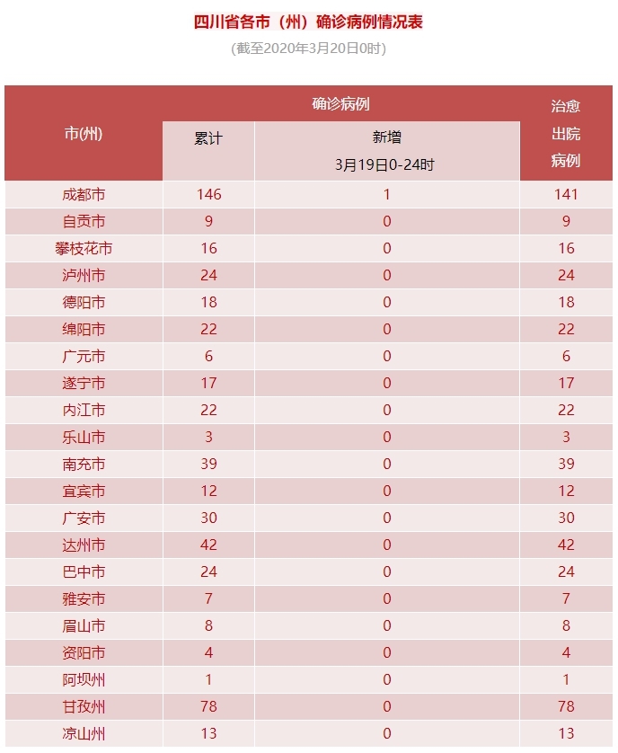 四川在线消息(记者 石小宏 殷鹏)3月19日0-24时,四川省新型冠状病毒肺炎新增境外输入确诊病例1例(3月15日从美国纽约经台北中转,于3月17日抵达成都后即接受隔离医学观察和动态诊疗,于3月19日确诊),相关密切接触者正在实施追踪和集中隔离医学观察。新增治愈出院病例5例,无新增疑似病例,无新增死亡病例。