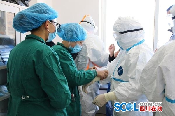 参与疫情防控的医护人员互相整理防护服。 谢臣仁 摄