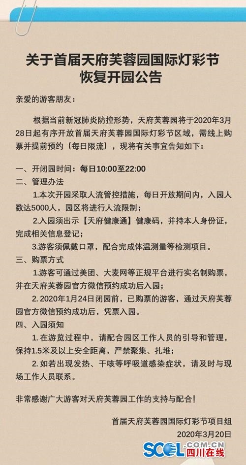据了解,有序恢复开园后,每日开闭园时间为10:00至22:00,开园采取人流管控措施,每日开放期间内,入园人数达到5000人,园区将进行人流限制。入园还须出示“天府健康通”健康码,并持本人身份证,完成相关信息登记。游客还须佩戴口罩,配合完成体温测量等检测项目。