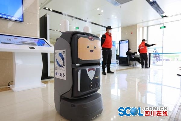 它身高一米左右,身着锦江区政务服务中心的工作服,一边在大厅“巡逻”,一边头顶着两个消毒器,自动地喷出含氯消毒液纳米级雾滴,配合头部的摄像设备,按照预设的地图和路径进行360度无死角干雾消毒,遇到行人或是障碍物,它会自动躲避并更改行动线路。