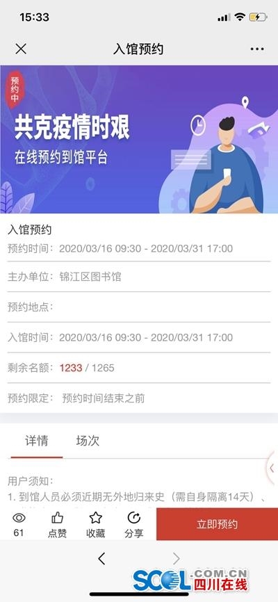 1、读者可以过锦江区图书馆官方微信公众号"成都市锦江区图书馆"识别二维码填写《图书馆场馆借阅预约管理》。
