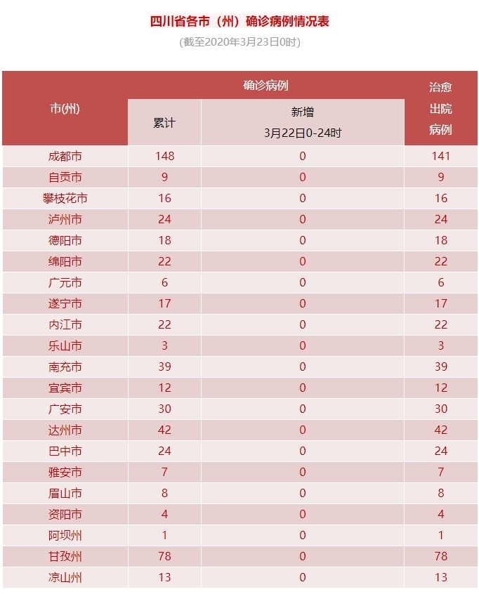 四川在线消息(记者 石小宏 殷鹏)3月22日0-24时,四川省新型冠状病毒肺炎无新增确诊病例,无新增治愈出院病例,无新增疑似病例,无新增死亡病例。