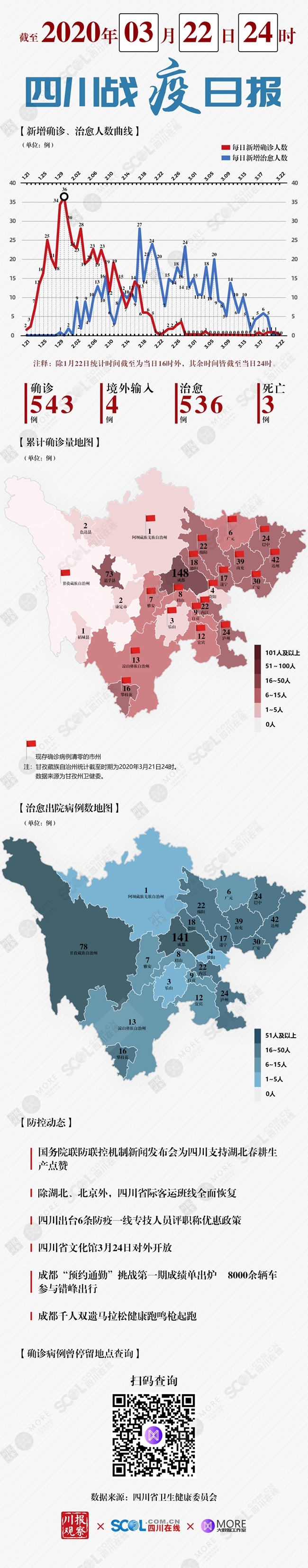 截至3月23日0时,四川省累计报告新型冠状病毒肺炎确诊病例543例(其中4例为境外输入病例),涉及21个市(州)。