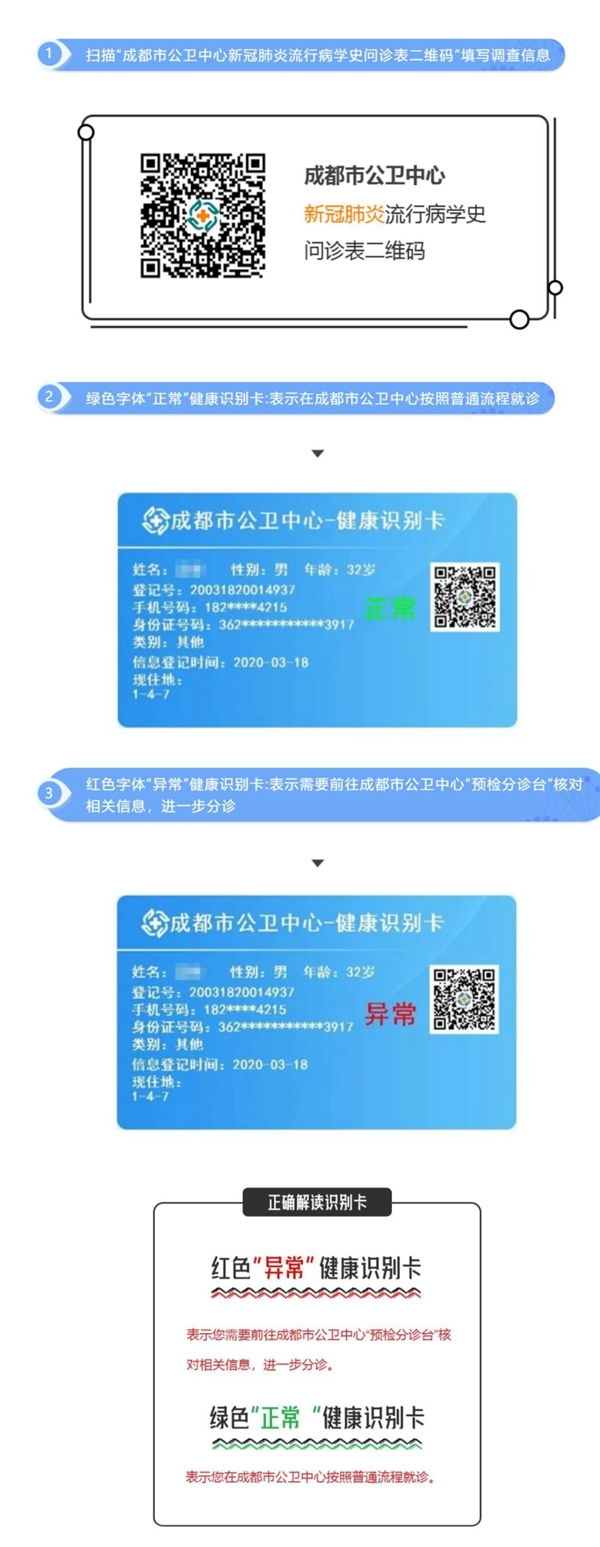 其中,红色“异常”健康识别卡,表示患者需要前往成都市公卫中心“预检分诊台”核对相关信息,进一步分诊。绿色“正常”健康识别卡,表示患者在公共卫生中可以按照普通流程就诊。