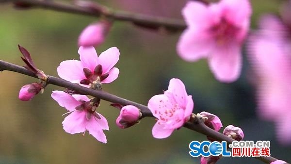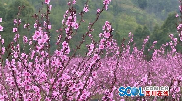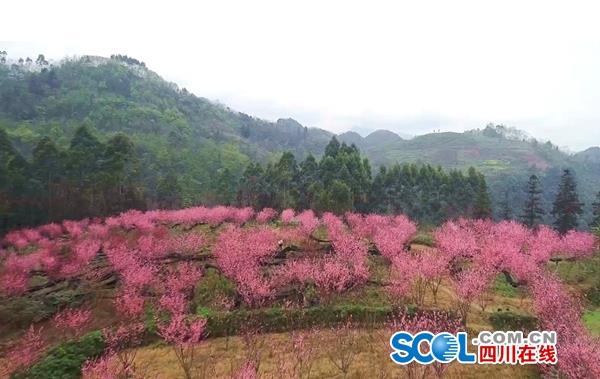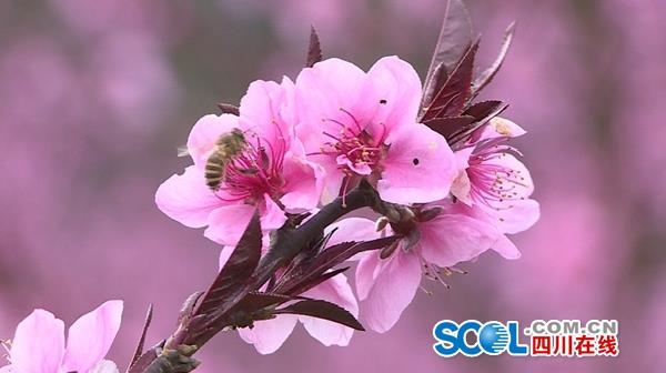 阳春三月,花开天府。3月23日,乐山峨眉山市,位于峨眉山之南,临江河之西的罗目镇郭坪村红叶桃开得正盛。