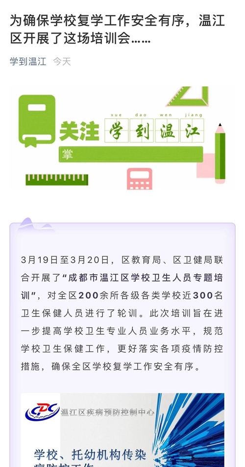 消息称:“3月19日至3月20日,区教育局、区卫健局联合开展了“成都市温江区学校卫生人员专题培训”,对全区200余所各级各类学校近300名卫生保健人员进行了轮训。此次培训旨在进一步提高学校卫生专业人员业务水平,规范学校卫生保健工作,更好落实各项疫情防控措施,确保全区学校复学工作安全有序。”