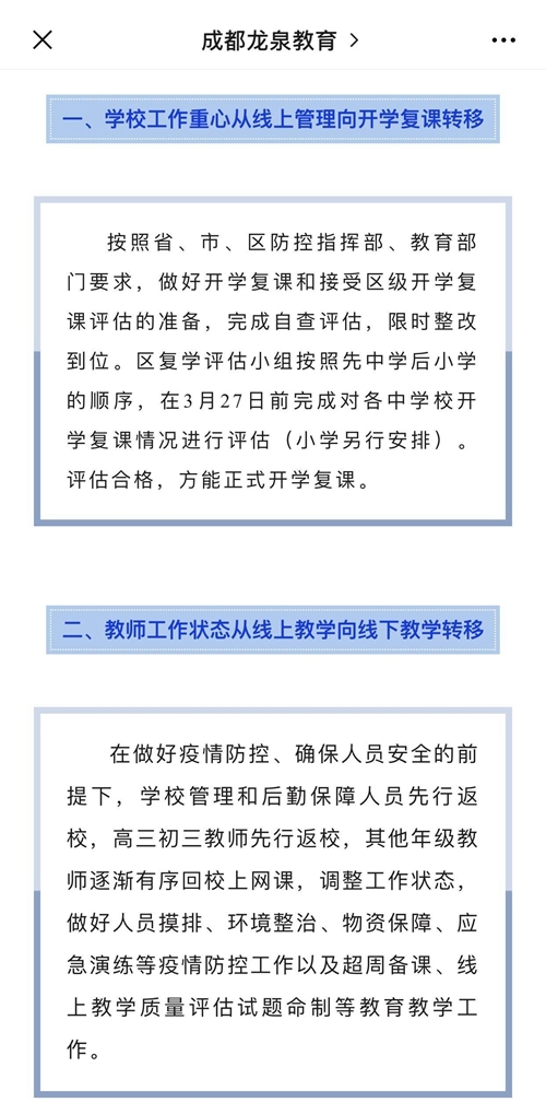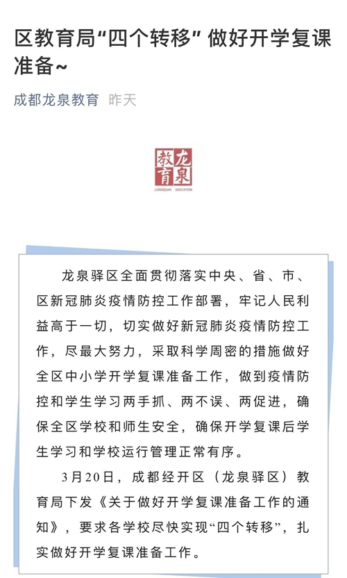 与此同时,根据成都市龙泉驿区教育局官方微信消息:3月20日,成都经开区(龙泉驿区)教育局下发《关于做好开学复课准备工作的通知》,要求各学校尽快实现“四个转移”,扎实做好开学复课准备工作。“区复学评估小组按照先中学后小学的顺序,在3月27日前完成对各中学校开学复课情况进行评估(小学另行安排)。评估合格,方能正式开学复课。”