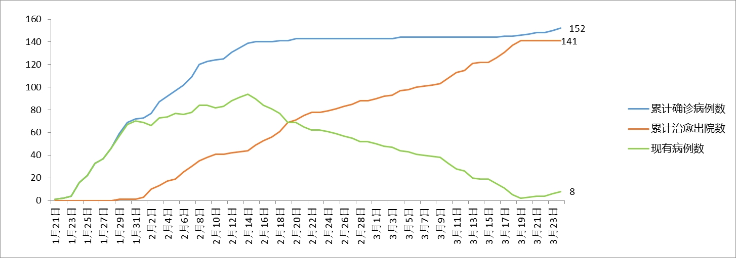 截至3月24日24时,成都市累计报告确诊病例152例,累计出院141人,死亡3人,其余8人(均为境外输入病例)在定点医院隔离治疗。尚有密切接触者494人(含外地确诊病例在蓉管理的密切接触者)正在接受医学观察。