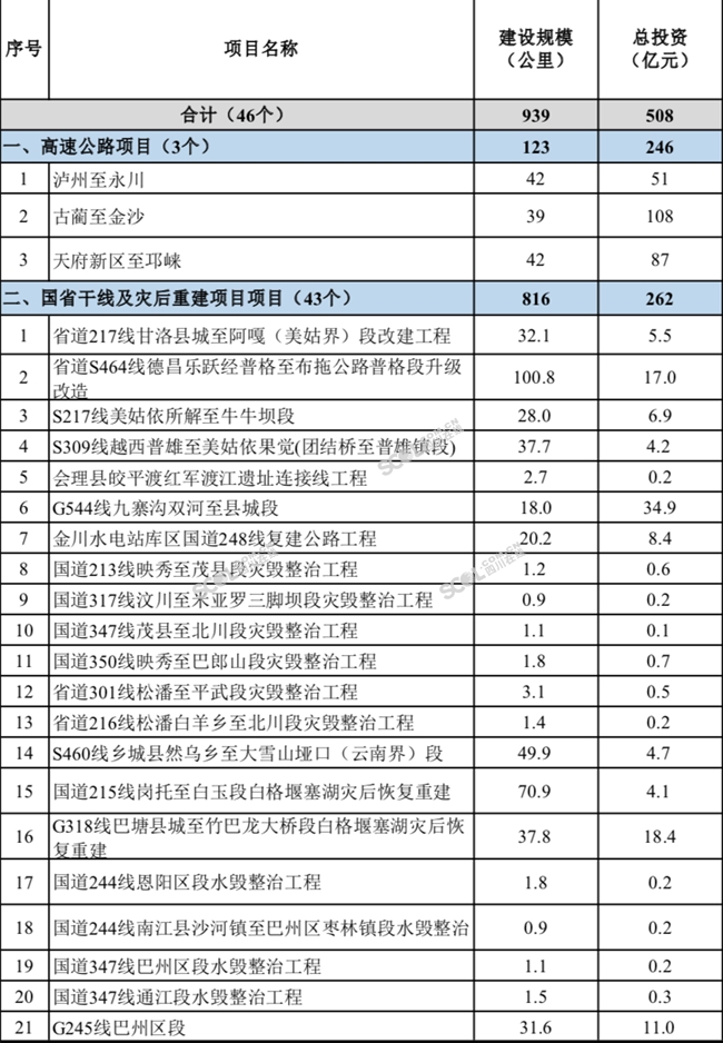 这批公路项目涉及泸州、凉山、阿坝、甘孜、成都、绵阳、广元、雅安、巴中、广安、宜宾、乐山、攀枝花等13个市(州),有三个突出特点: