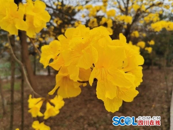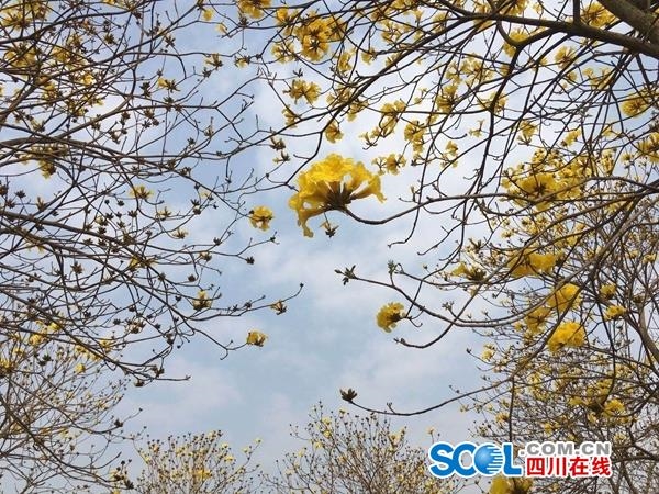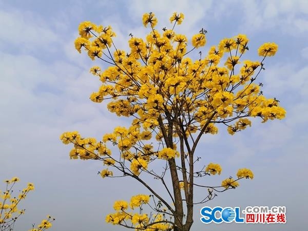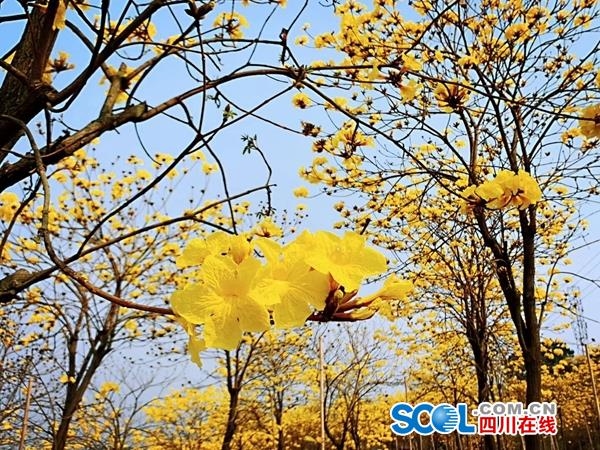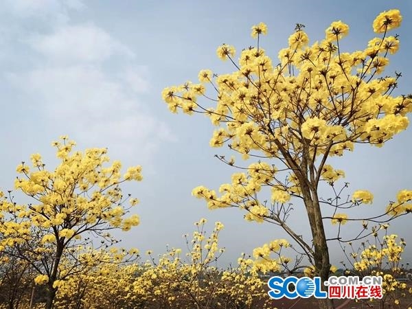 四川在线消息(刘煜瑞 记者 郑志浩)3月26日,内江市资中县明心寺镇宜古寺村的一片黄花风铃木苗木林中,三月的蓝天白云下,金黄的花朵挂满树枝,一树就成一景。一群游客正在花树丛恣意的凹造型、摆姿势,有美景美花相衬,往来游人们的笑容也更显绚烂。