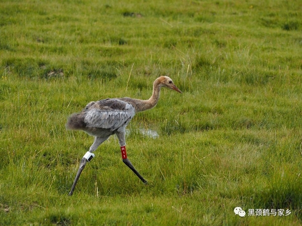 环志后释放的幼鹤,右腿佩戴红色彩环,“R”代表“若尔盖” 李凤山 摄
