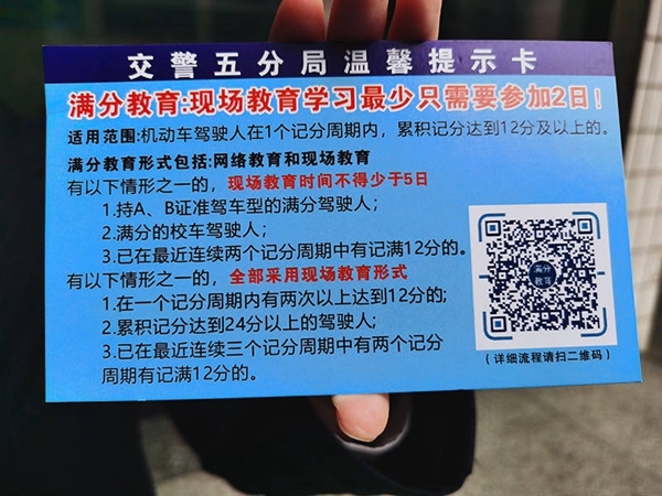 同时,分局制作了“交警五分局温馨提示卡”依托交警路面执勤,充分发挥现场查处与现场教育相结合的优势,积极开展和驾驶员面对面宣传推广。驾驶员可以通过民警发放的“温馨提示卡”内容,详细、全面了解和使用“交管12123”互联网服务平台参加审验、满分教育的学习。特别是针对A、B照重点驾驶员定向推送“交管12123”互联网服务平台开展审验教育流程、步骤。让驾驶员会预约、懂使用,实现网上方便快捷办理审验教育业务。不断扩大“交管12123”互联网服务平台群众知晓率的广度和深度。