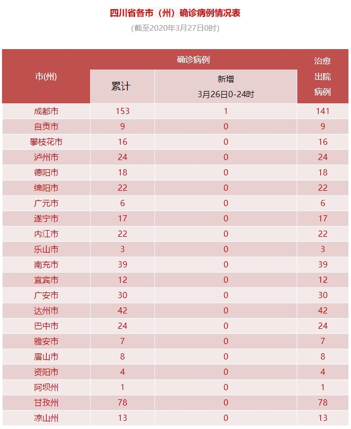 截至3月27日0时,四川省累计报告新型冠状病毒肺炎确诊病例548例(其中9例为境外输入),已治愈出院536人,死亡3人,目前在院隔离治疗9人,709人正在接受医学观察。