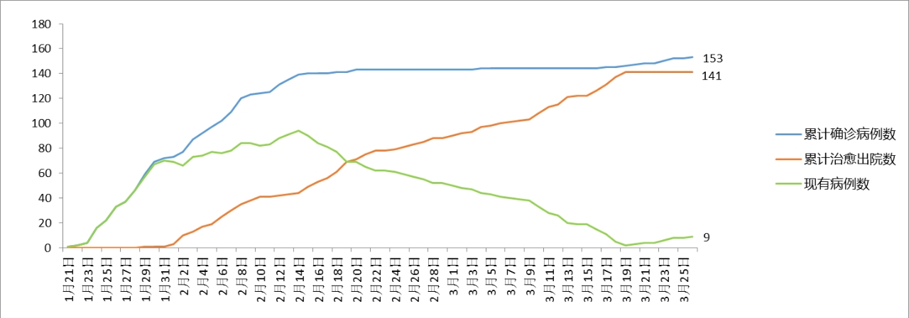 截至3月26日24时,成都市累计报告确诊病例153例,累计出院141人,死亡3人,现有9名境外输入确诊病例在定点医院隔离治疗。尚有密切接触者545人(含外地确诊病例在蓉管理的密切接触者)正在接受医学观察。