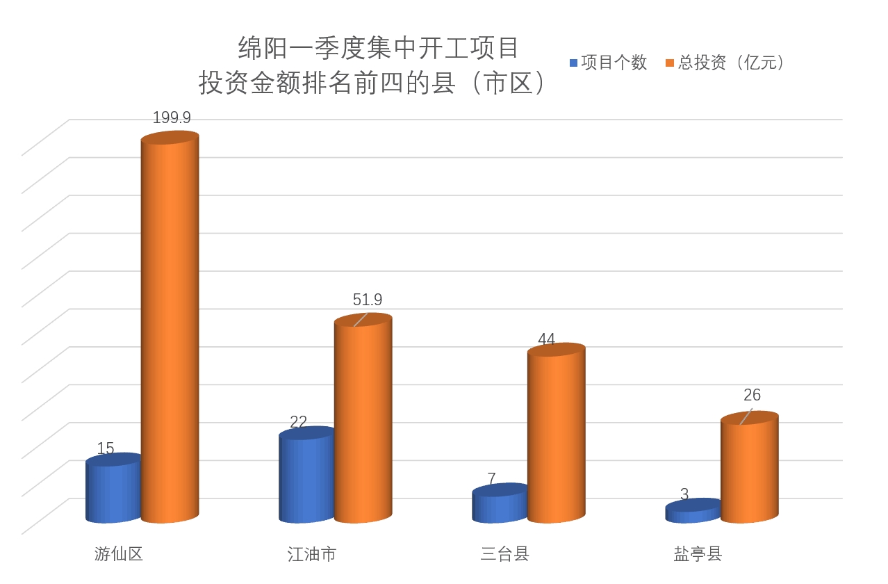 从投资额来看, 此次集中开工项目中,“一核”中的涪城、安州等6个县市区(园区)有34个项目开工,投资额247.4亿元,占全市项目总投资的62%,其中,游仙区以199.9亿元投资额位列绵阳各县市区(园区)的第一位。作为 “两翼”中的“北翼”江油市和“南翼”三台县,展现出齐头并进的态势,分别以51.9亿元和44亿元的投资额位列绵阳各县市区(园区)的二、三位;值得一提的是,属于“三区”中东南丘陵片区的盐亭县,此次表现也很抢眼,以26亿元的投资额位列绵阳各县市区(园区)的第四位。