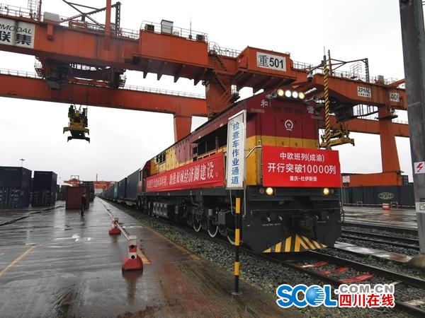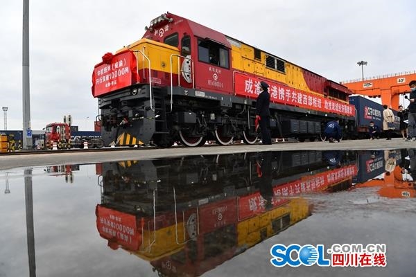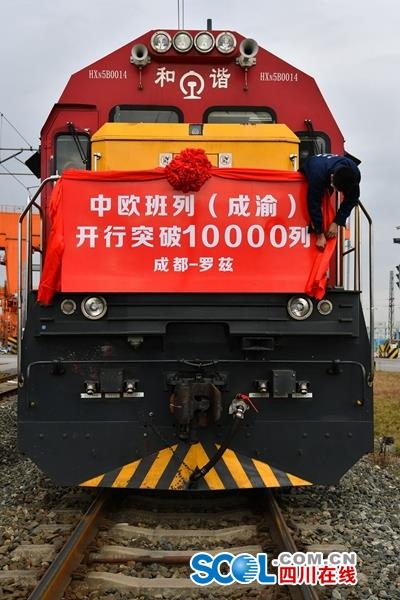 更明显的变化是,本次列车的车头装饰着“中欧班列(成渝)开行突破10000列”的标牌,火车机身上亦挂着“成渝两港携手共建西部枢纽,助推双城经济圈建设”横幅,以此强调:在成渝地区双城经济圈建设的背景下,作为向西开放重要陆路运输的中欧班列,开启了融合发展的进程。