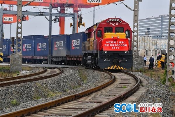 3月27日上午10:30,随着汽笛喧鸣,中欧班列(成渝)缓缓启动,满载着电子配件、机械制品等货物同时从成都国际铁路港、重庆国际物流枢纽园区驶向数千公里外的欧洲大陆。