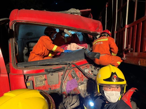 在赶赴现场途中,战队指挥员与报警人取得联系,了解到交通事故情况,有1人被困。消防人员到达现场后,经过事故侦察发现,交通事故现场为两辆大货车疑是在转弯过程中发生碰撞,其中一辆货车撞击另一辆货场侧方,使得驾驶室变形严重,一名男子被困驾驶室内,左腿被紧紧卡住,动弹不得。
