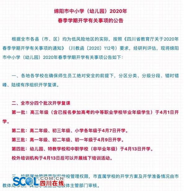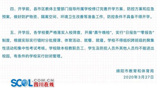四川在线消息(刘毅 记者 祖明远)3月27日下午,绵阳市教育和体育局发布关于2020年全市中小学(幼儿园)春季学期开学有关事项的公告。经研判评估,现将绵阳市中小学(幼儿园)2020年春季学期开学有关事项公告如下: