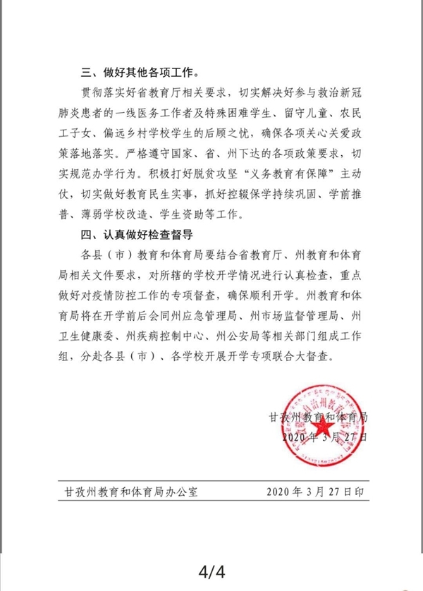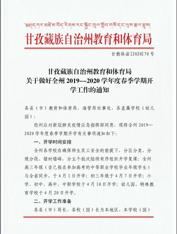 四川在线消息(记者 游飞)3月27日,甘孜州教育和体育局发布《关于做好全州2019—2020学年度春季学期开学工作的通知》,安排全州开学时间。