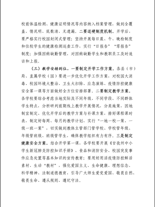 《通知》要求全州各学校在确保师生员工安全的前提下,分区分类、分级分段、错时错峰,分五个批次陆续有序组织开学复课:全州高三年级(含已报名参加高考的中等职业学校毕业年级学生)与全省同步,于4月1日开学;初三年级于4月7日开学;小学、初中、高中、中职学校于4月10日开学;幼儿园、特殊教育学校于4月20日开学。