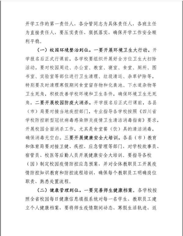 《通知》要求开学报名后正式行课前,各学校要组织开展好全方位卫生大扫除、校园防疫大消杀和健康安全大培训。在健康管理方面,要完善师生健康档案。各学校按照全省校园每日健康信息填报系统对每一名学生、教职员工建立个人健康档案,要将师生疫情期间动态、寒假生活轨迹、返校前体温检测、健康证明情况等内容纳入档案管理,做到全覆盖、情况明、底数清、无遗漏。同时要逗硬制度机制。开学后,要严格实行校园封闭式管理;坚持开展每日晨、午、晚检制度和住校学生的健康检测巡查工作,实行“日报告”“零报告”制度;加强因病缺勤管理,对因病缺勤学生和教职员工及时追访和上报。