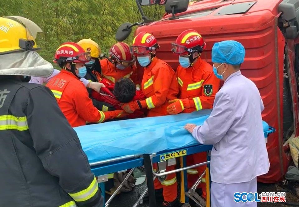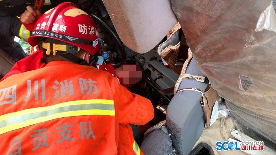 救援力量到达现场时,一辆带吊臂的货车90度侧翻在自贡服务区入口处,货车驾驶员被卡驾驶室难以动弹,但意识清醒。根据掌握的情况,救援人员借助电动扩张钳等工具进行扩张救援。