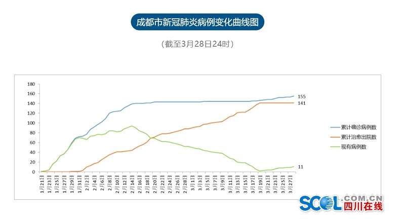 截至3月28日24时,成都市累计报告确诊病例155例,累计出院141人,死亡3人,现有11名境外输入确诊病例在定点医院隔离治疗。尚有密切接触者593人(含外地确诊病例在蓉管理的密切接触者)正在接受医学观察。