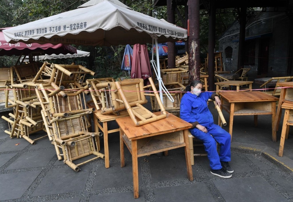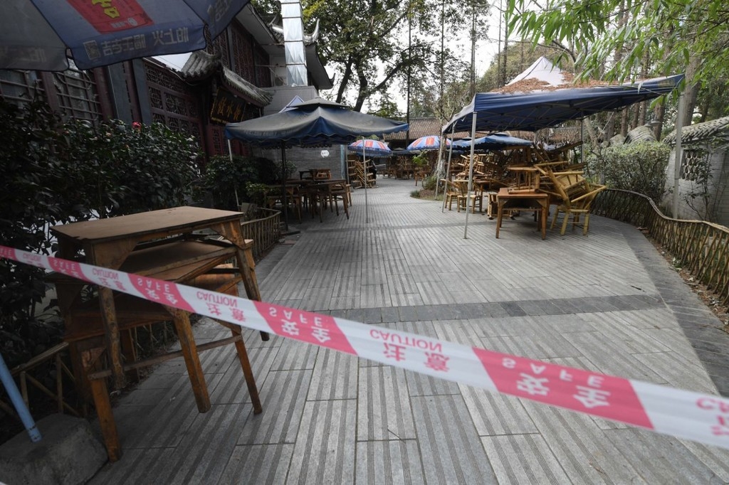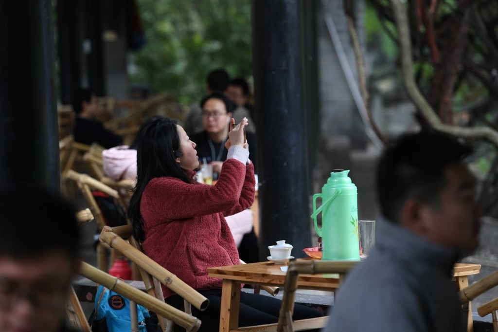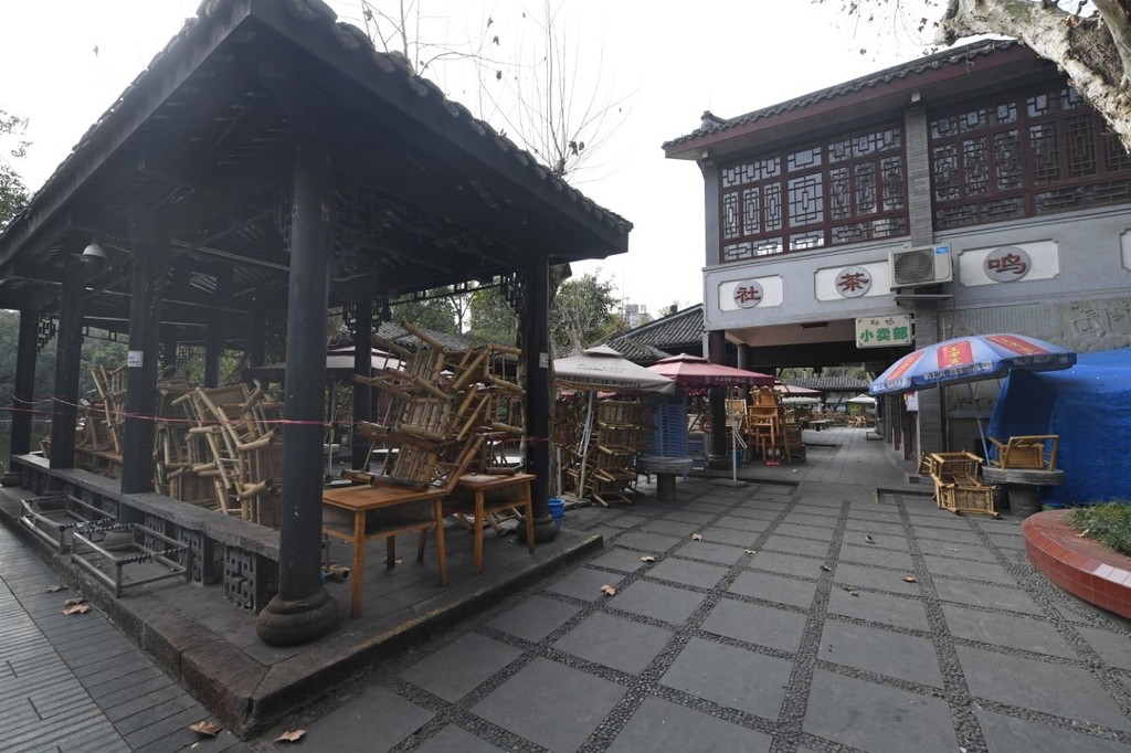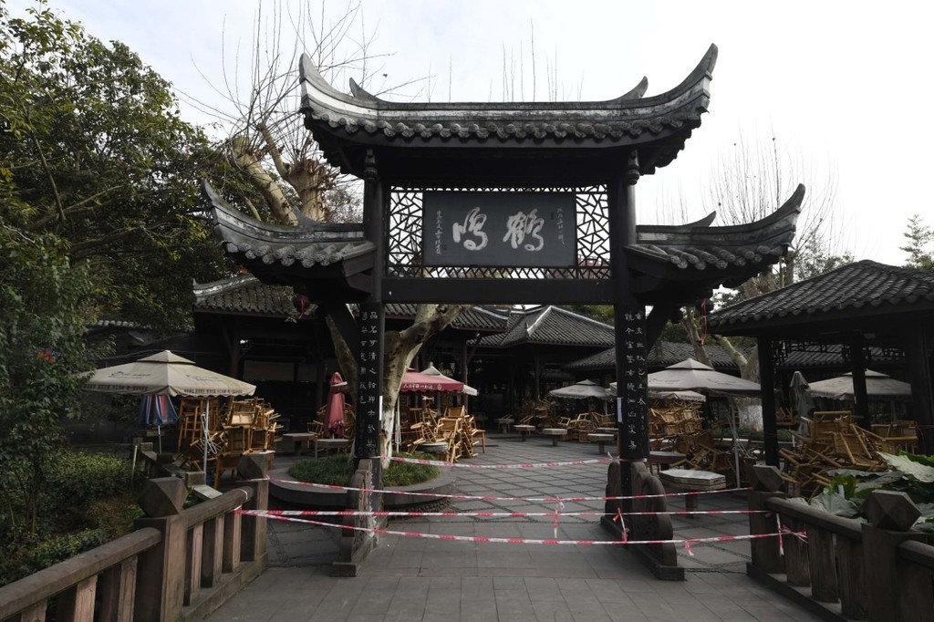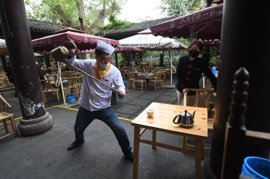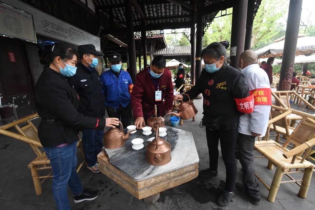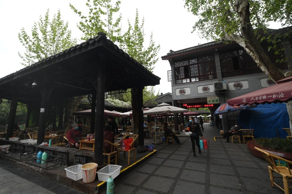 目前,鹤鸣茶社只开放了一半区域,桌与桌间的距离也有所加大。进场的每位茶客都需要戴口罩、测体温。