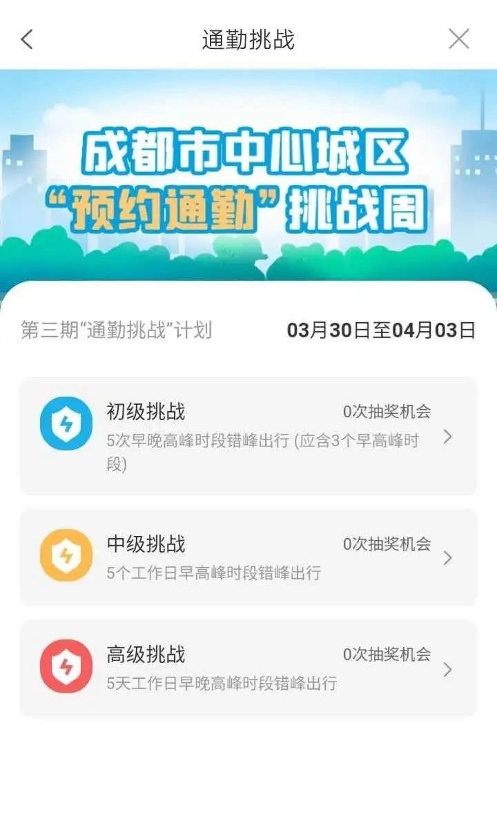 四川在线消息(记者 付真卿)由成都市委社治委、市总工会、市公安局联合推出的成都市中心城区“预约通勤”活动已经进行了两轮“挑战”。在参与市民和企业继续踊跃报名、积极挑战的同时,任务成功率也是稳步上升。