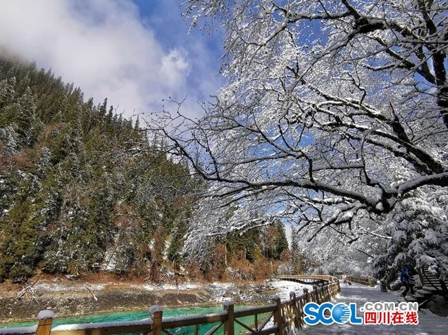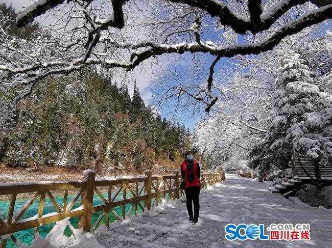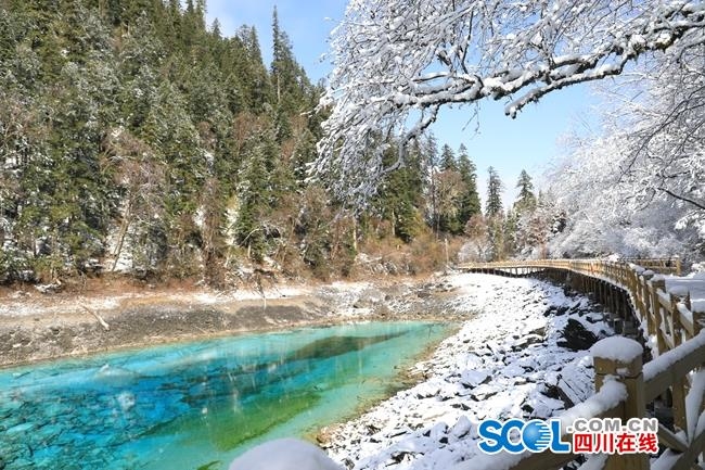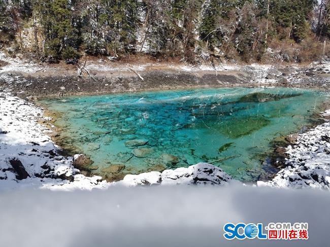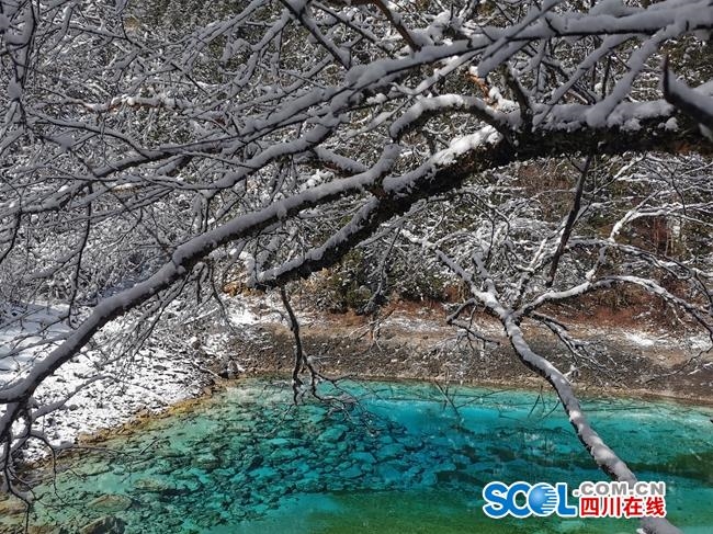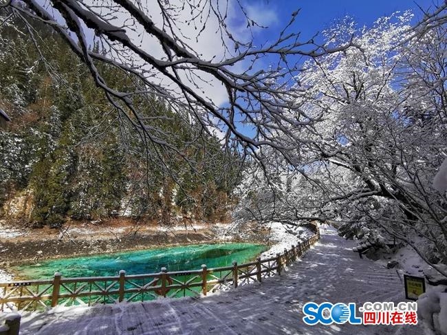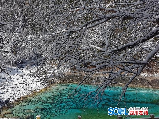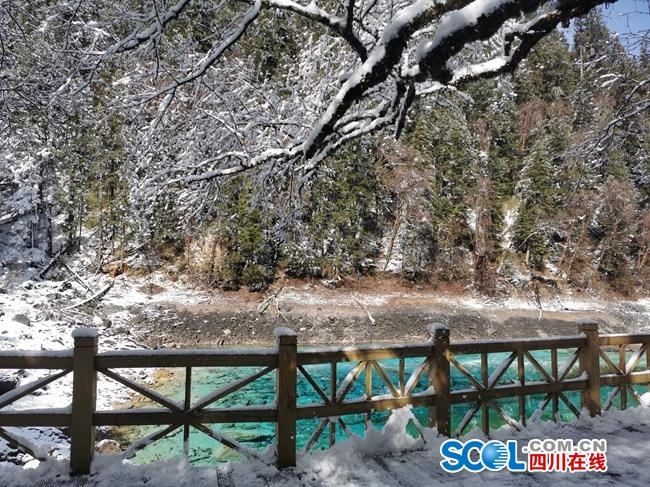 四川在线消息(陈静 记者 徐中成 周琳/视频)3月31日,海拔3000米左右的九寨沟景区五彩池景点处,森林、栈道堆起了厚厚的一层春雪。白白的积雪与五彩的海子,相映成趣,把“九寨之眼”五彩池装扮得美如童话世界。
